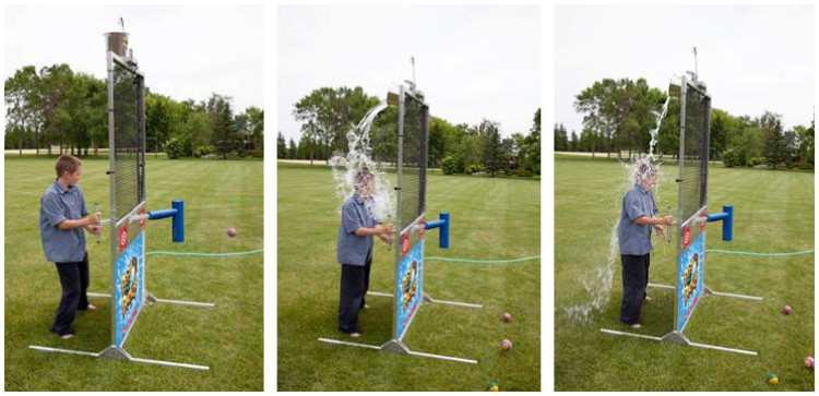 Unlike a traditional dunk tank where someone simply waits to get soaked, this interactive version lets the “dunkee” defend themselves by blocking two dunk targets with a moving arm while challengers throw waterlogged balls. Hit the target, and a bucket of water dumps instantly, then automatically resets for continuous, fast-paced action.